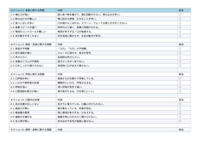 チェックリスト評価: 食べる・話す・その他機能を評価し、2項目以上(うち1つは「食べる機能」)に該当すると診断となります。