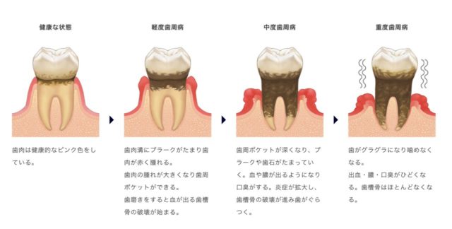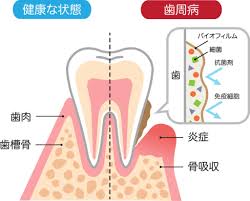 歯周病は、歯を支える歯ぐきや骨に炎症が起き、進行すると歯を失う原因になる病気です。細菌による歯垢(プラーク)が原因で歯ぐきが腫れ、出血や口臭が起こり、進行すると歯がグラグラして噛めなくなります。