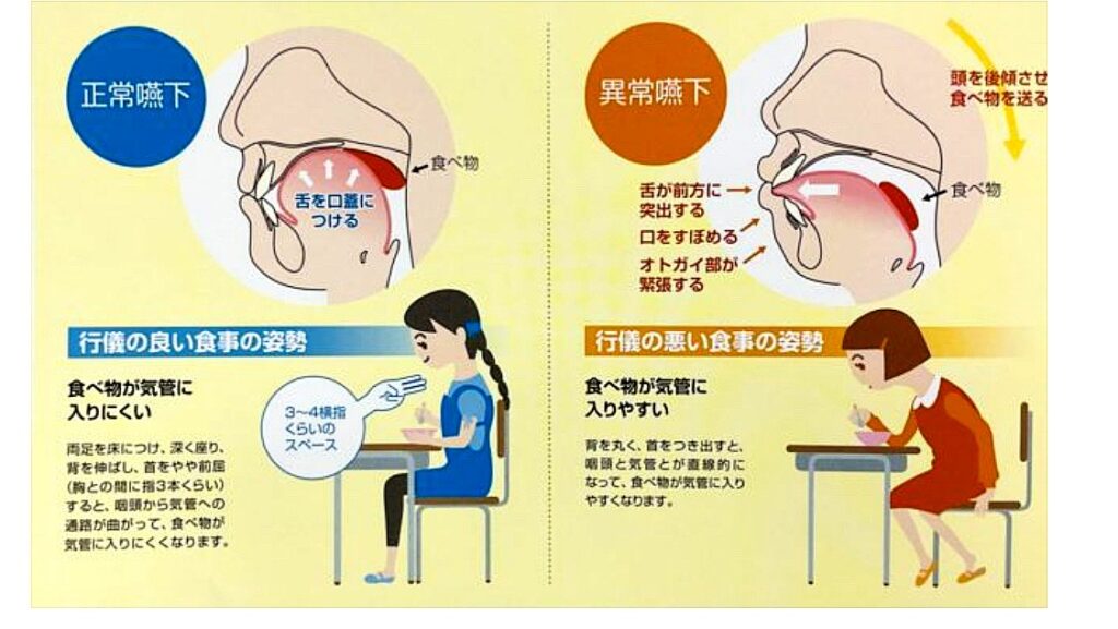 正常嚥下と異常嚥下の比較(食事姿勢イラストつき)