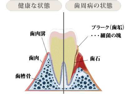 プラークに潜む細菌が炎症を引き起こし、歯ぐきや歯を支える骨を徐々に壊していきます。