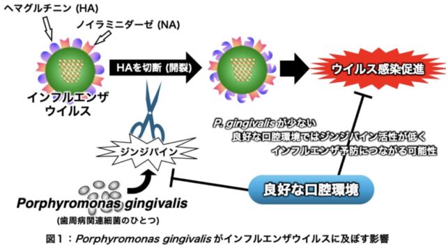 Porphyromonas gingivalis gingipain potentially activates influenza A virus infectivity through proteolytic cleavage of viral hemagglutinin.