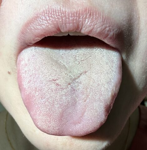 - スコア2:厚い舌苔
