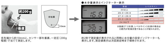 - 方法:滅菌綿棒で舌背を擦過し、細菌数を測定