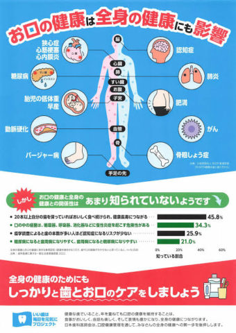 お口の健康は全身に影響する 2024.01.11 歯科情報ブログ お口の健康と全身の健康 口は生命を保つための入り口です食べることは生命を支えるうえで大切なことです。栄茶をしっかり取り込み、おいしく食べるためには、「歯」と「ロ」の体は欠かすことができないものです。口は大切なコミュニケーション器官で... 続きを読む